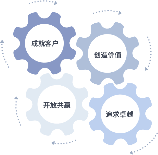 成就客户是一切决策的出发点,,创造价值是衡量所有工作的标准,,,追求卓越是我们做事做人的态度,,开放共赢是我们的格局也是最终的结果。。。。价值观的齿轮环环相扣,,,,推动着组织里的每个人不断向前。。